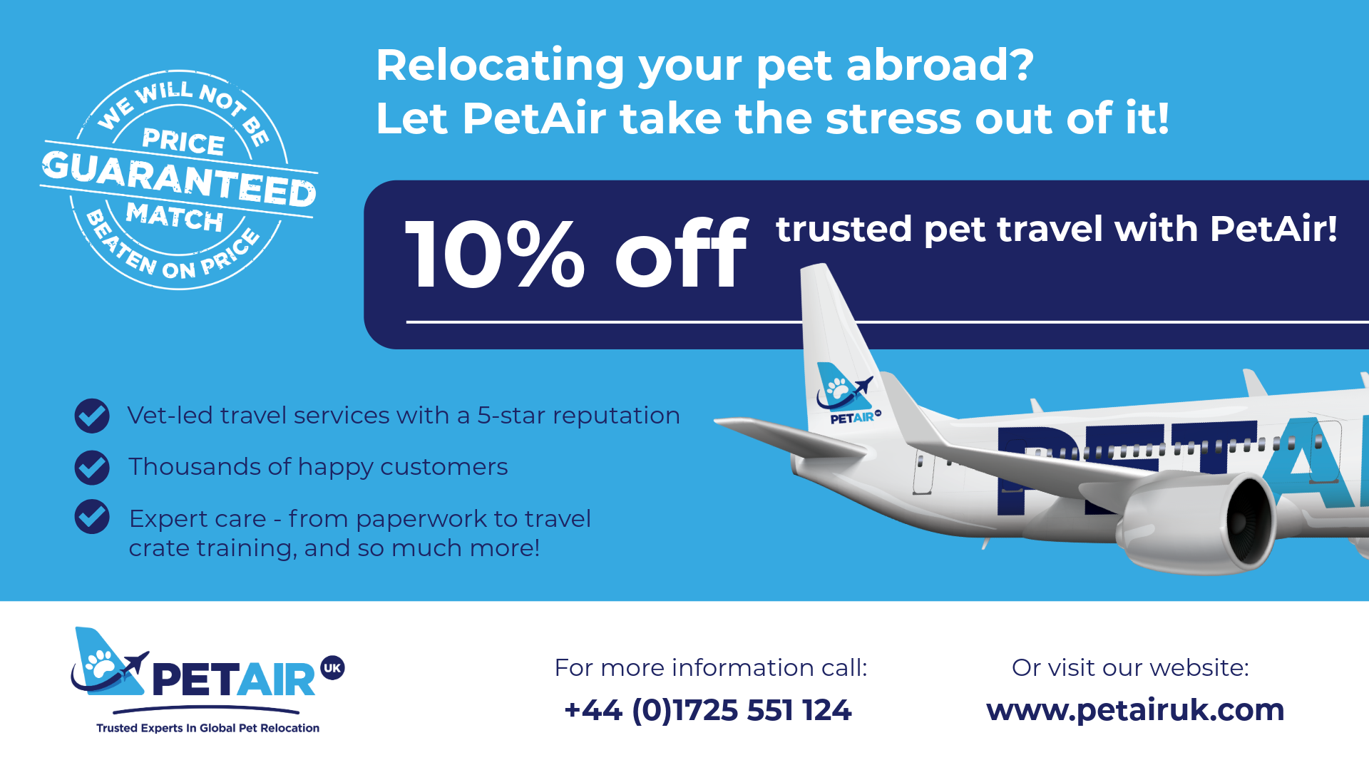 We're delighted to be able to offer registered clients 10% off PetAir services, making the journey a little easier on your pet and your wallet.